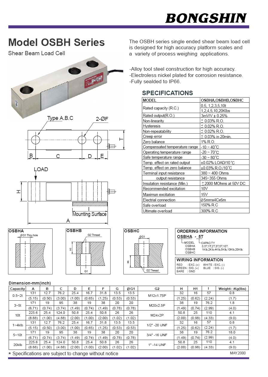 | 產(chǎn)品名稱:OSBH 懸臂梁稱重傳感器(load cell) |